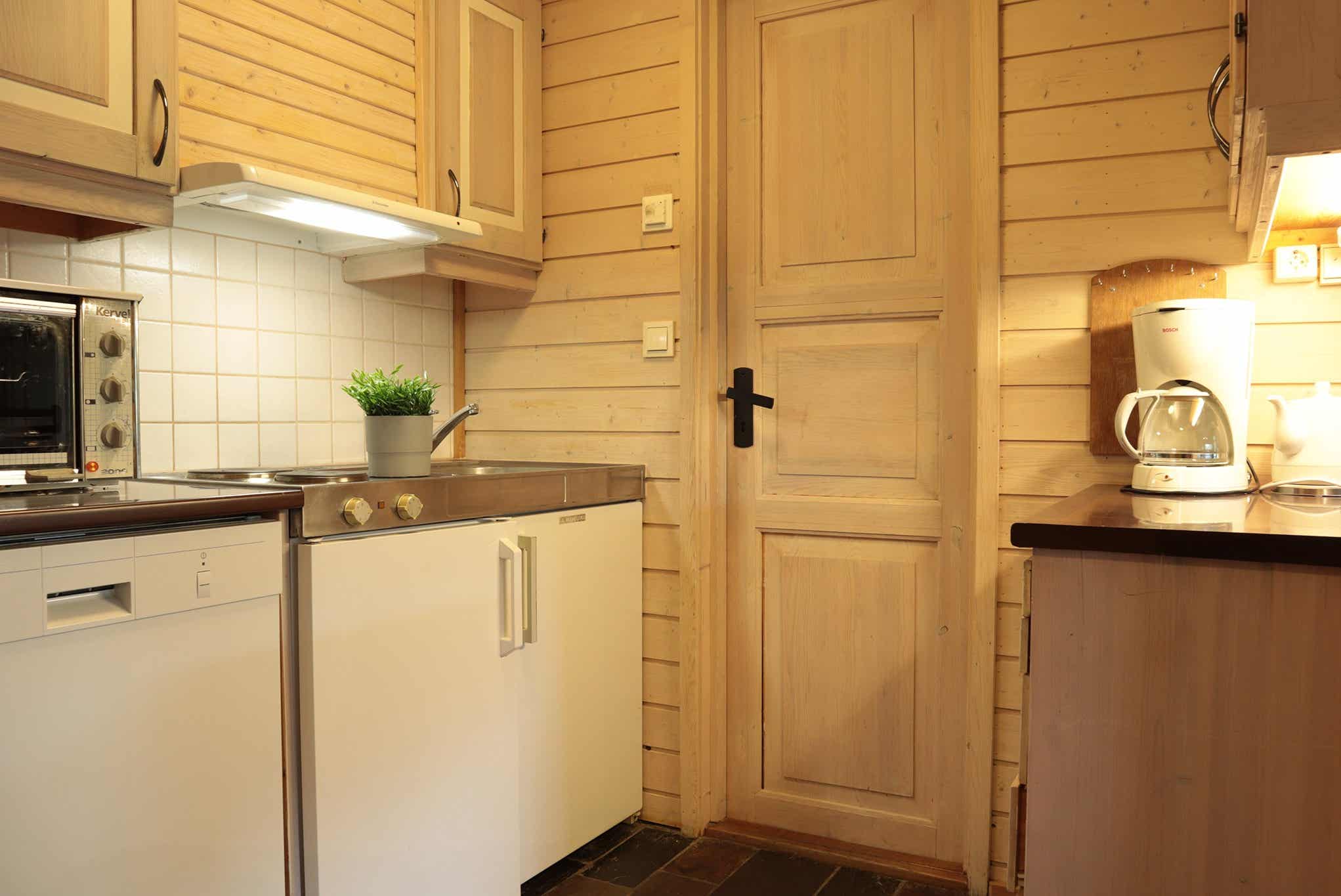 Keuken: klein fornuis met 2 kookplaten, kleine oven, koelkast, vaatwasser.