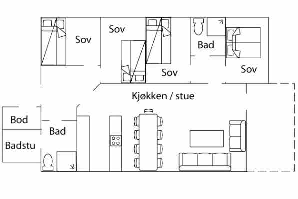 Slaapkamers:Slaapkamer 1= 1 tweepersoonsbed. Slaapkamer 2= 1 stapelbed met 150 cm breed onderbed. Slaapkamer 3= 1 stapelbed met 120 cm breed onderbed. Slaapkamer 4= 1 stapelbed met 120 cm breed onderbed.