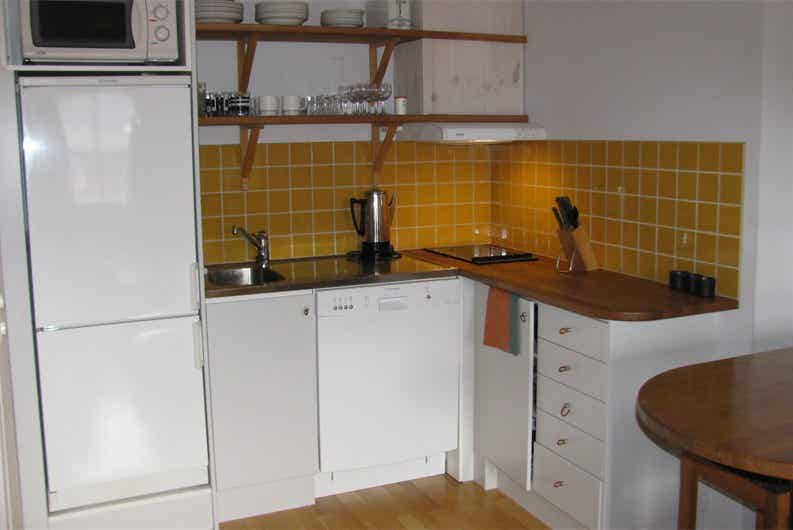 Keuken bevat kookplaat, koelkast met vriesvak, vaatwasser, magnetron (geen ander type oven).