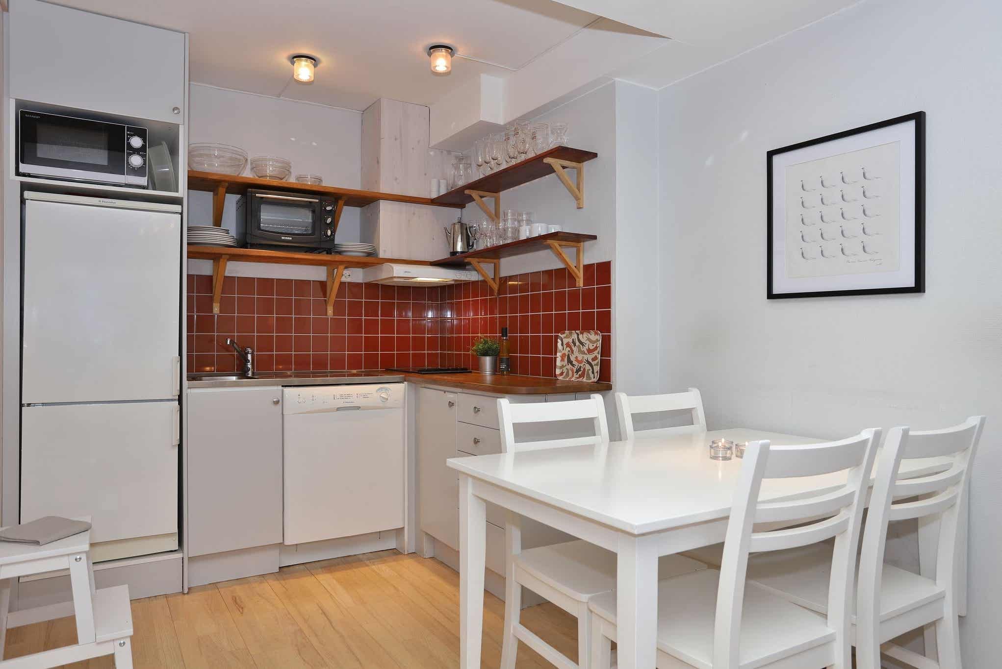 Keuken bevat kookplaat, magnetron (geen ander type oven), koelkast met vriesvak, vaatwasser.