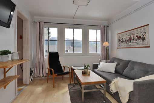 Woonkamer met keuken, slaapbank voor twee personen.