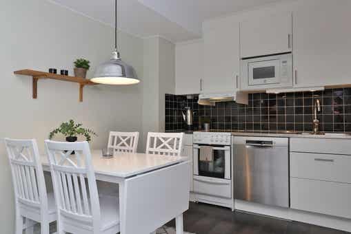 Keuken bevat fornuis met oven, koelkast en vriezer, vaatwasser, magnetron.