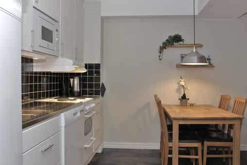 Keuken bevat fornuis met oven, koelkast en vriezer, vaatwasser, magnetron.