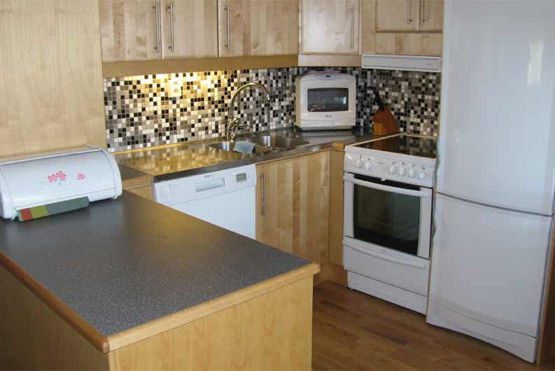 Keuken bevat kookplaat, oven, koelkast met vriesvak, vaatwasser, magnetron.