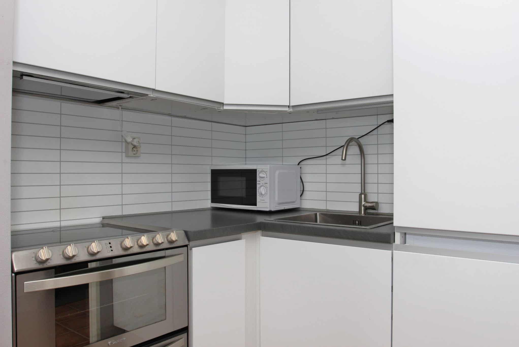 Keuken bevat fornuis met oven, koelkast, vriezer, vaatwasser, magnetron.
