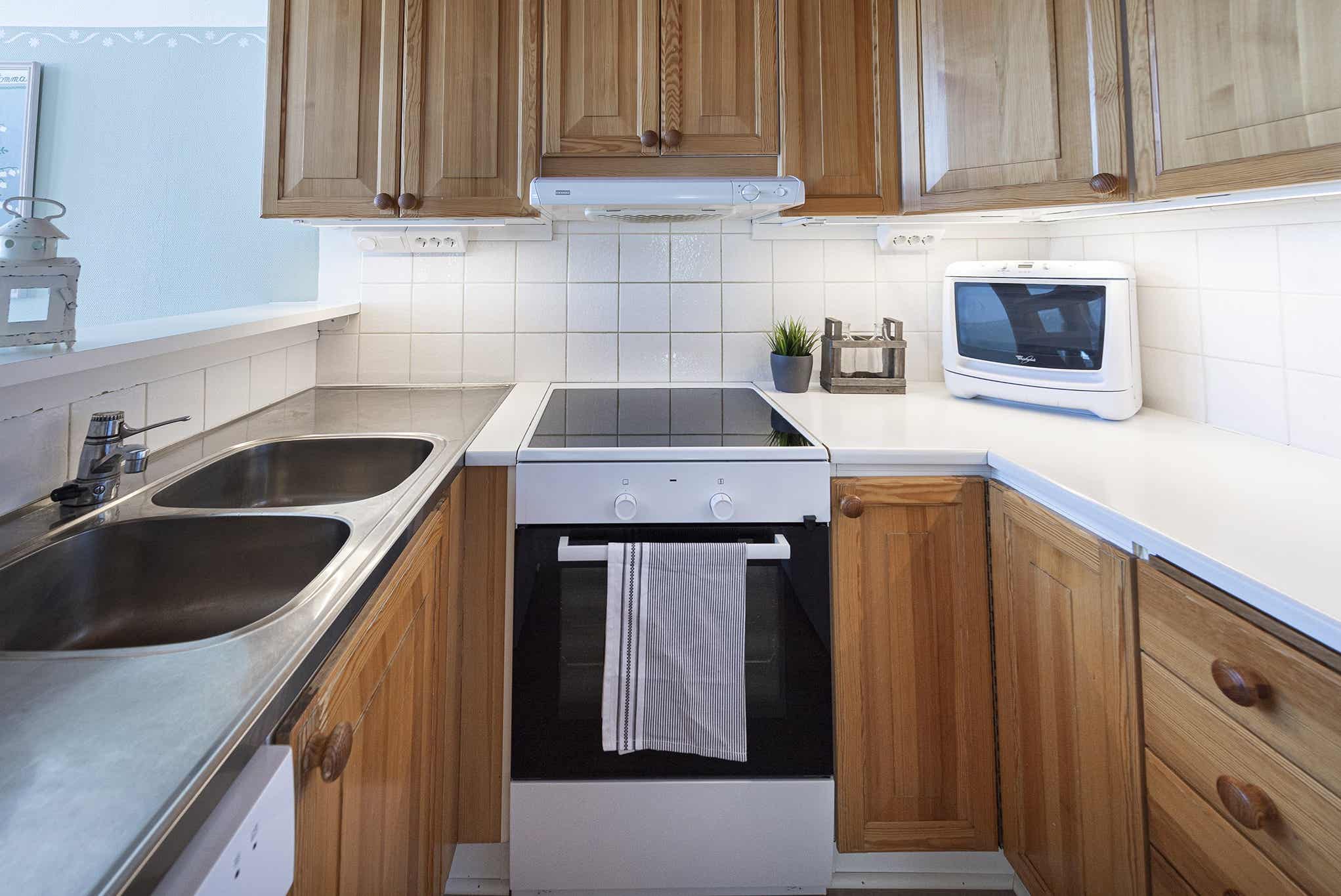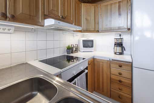 De keuken is voorzien van fornuis met oven, koelkast, vriezer, vaatwasser, magnetron.