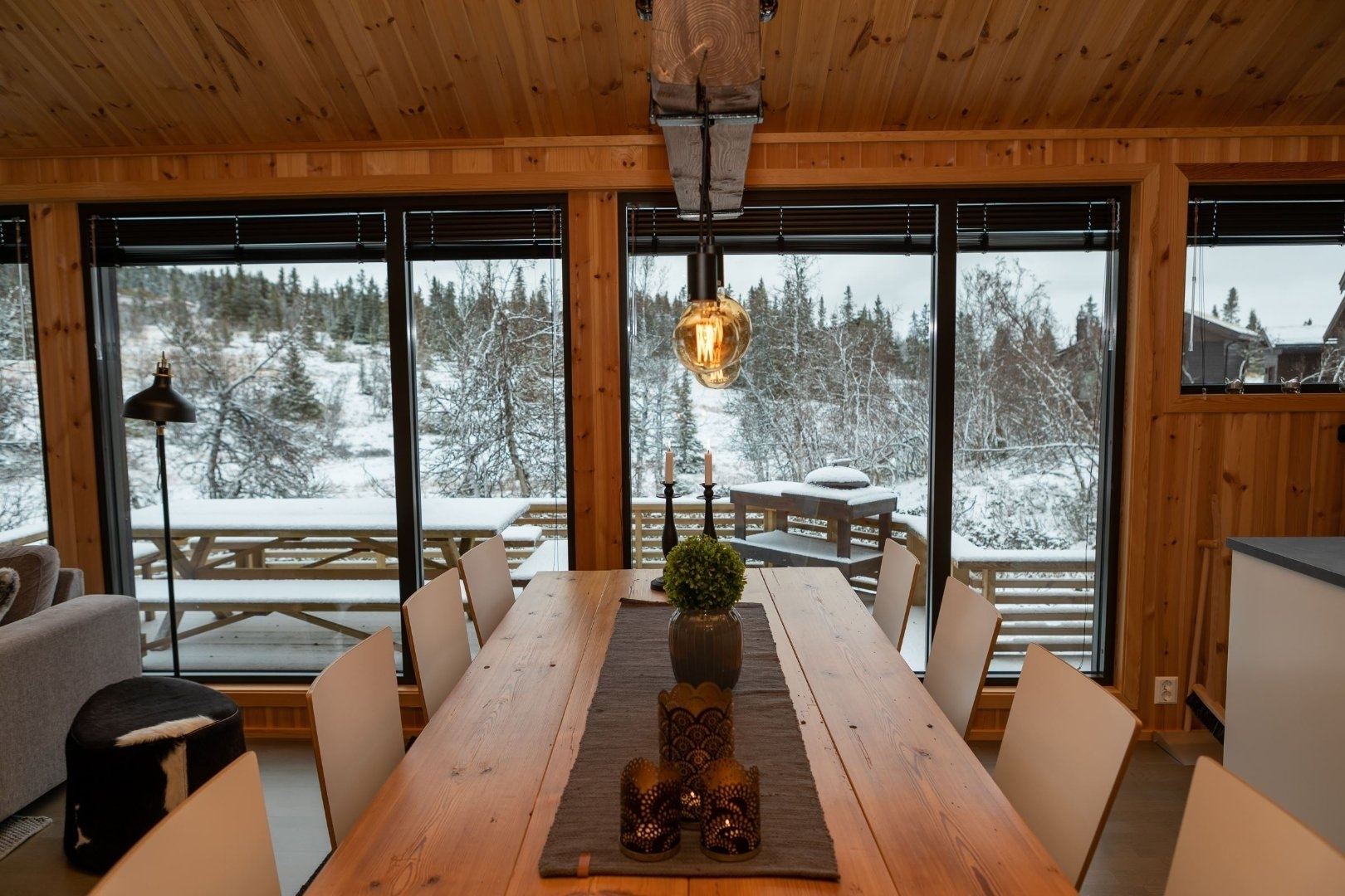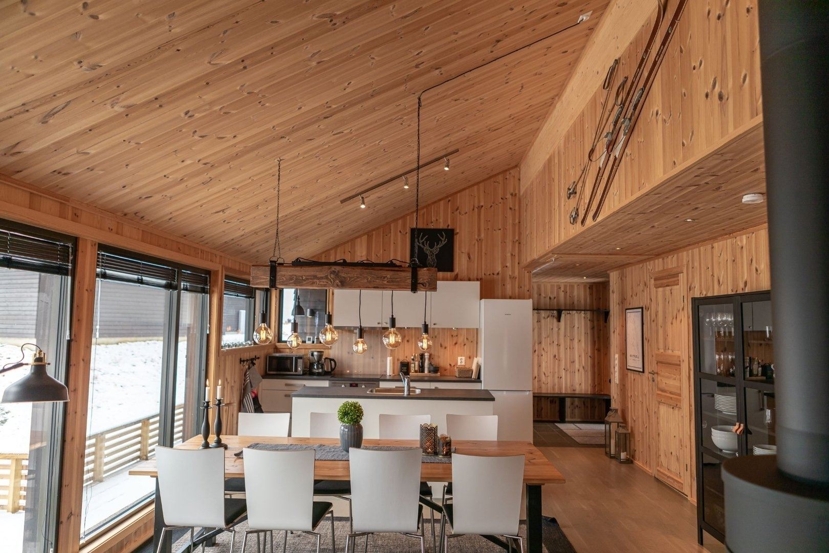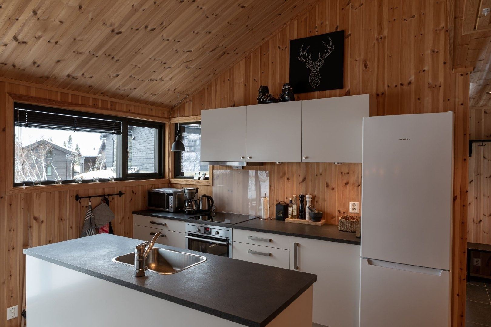 Bjønnlimorka 3 biedt alles wat u nodig heeft voor een ontspannen verblijf. De keuken is voorzien van een kookplaat, koelkast, vriezer, vaatwasser en koffiezetapparaat. De eetkamer biedt plaats aan 8 personen, ideaal om samen van een maaltijd te genieten. Na een dag vol activiteiten kunt u heerlijk ontspannen in de woonkamer, uitgerust met een bank, tv en een warme open haard, ideaal voor gezellige avonden bij het vuur.