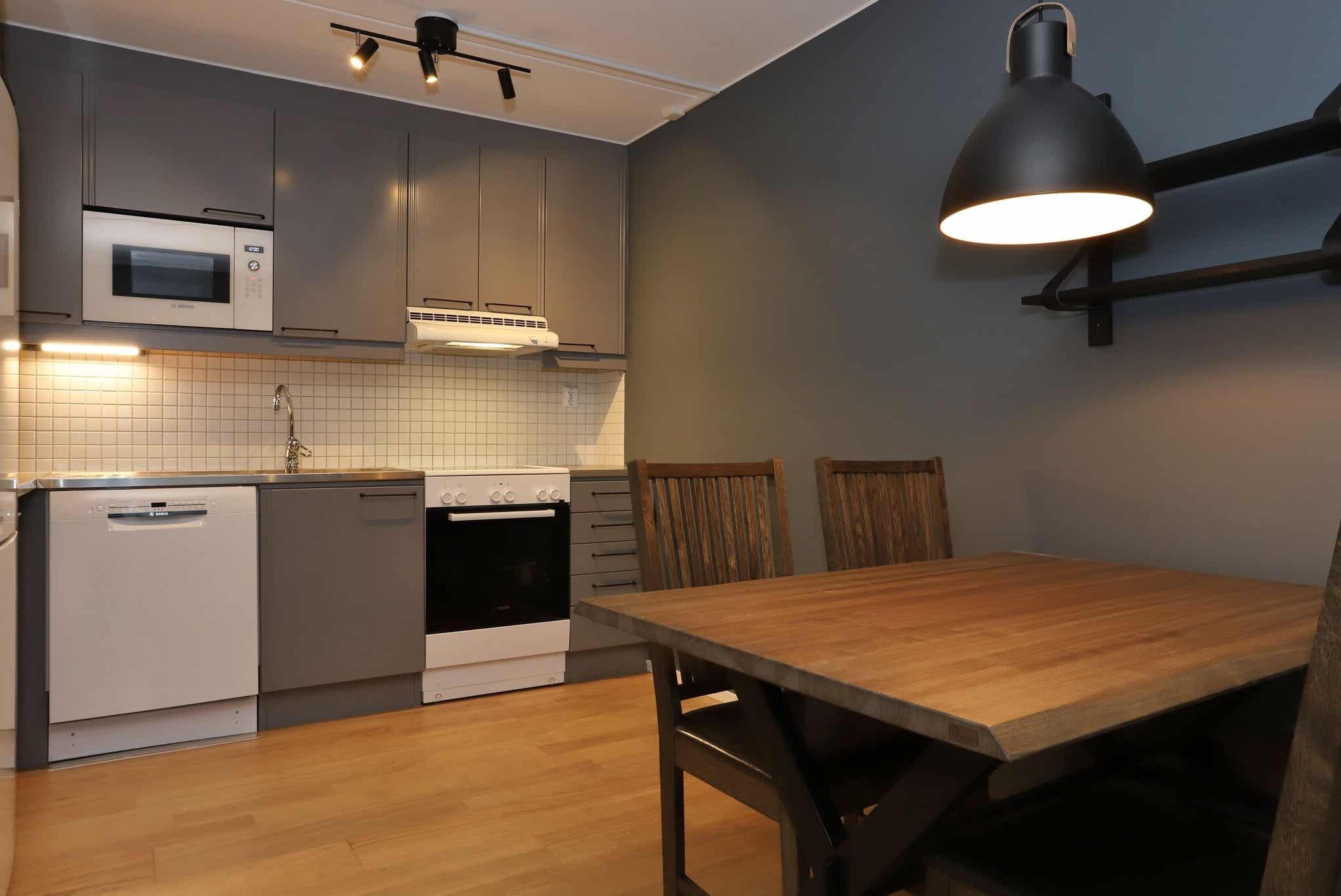 Keuken bevat fornuis met oven, koelkast en vriezer, vaatwasser, magnetron.