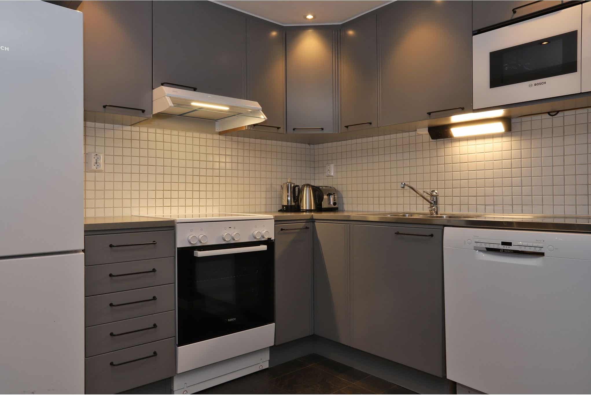 Keuken bevat fornuis met oven, koelkast en vriezer, vaatwasser, magnetron.
