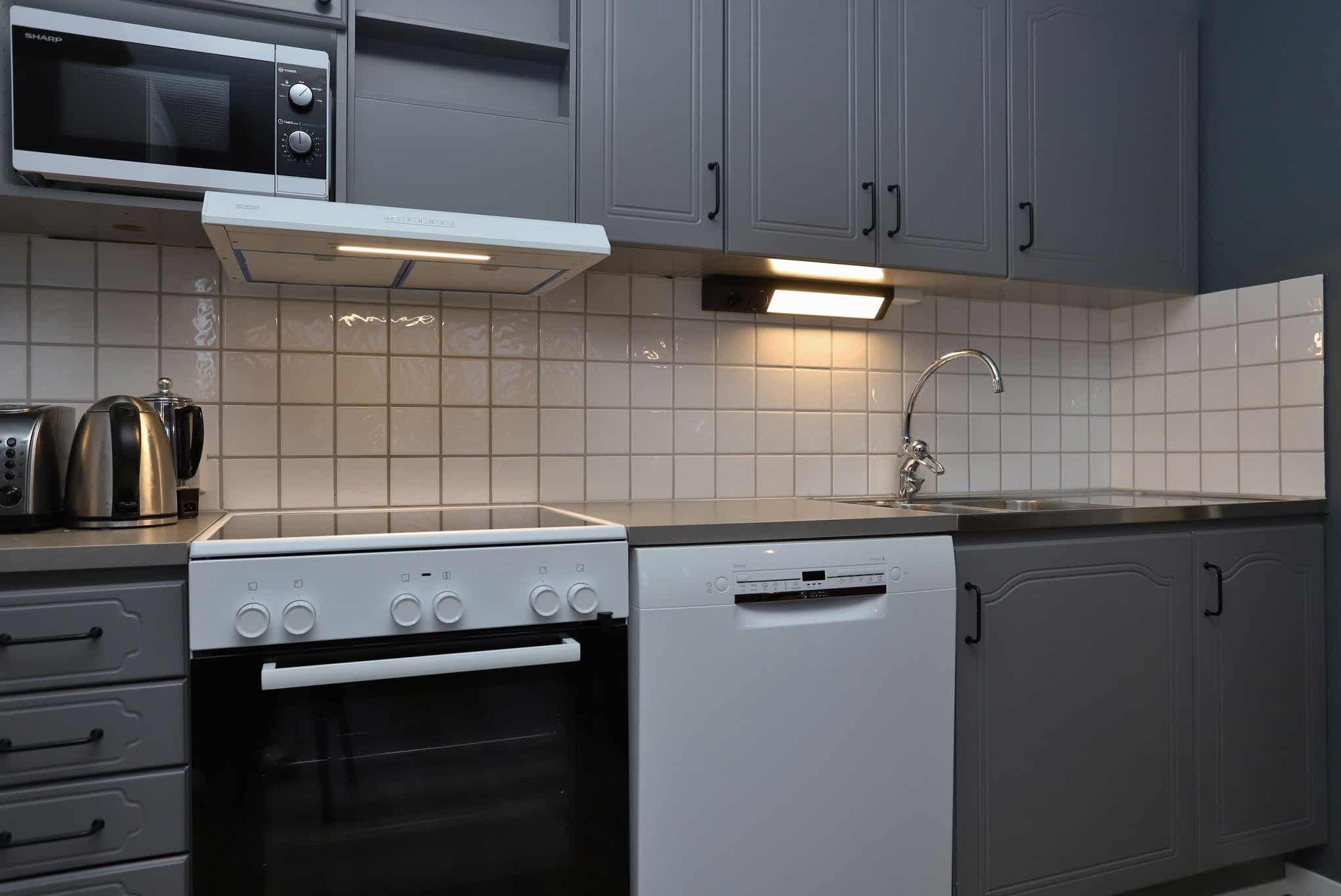 Keuken bevat fornuis met oven, koelkast en vriezer, vaatwasser, magnetron.
