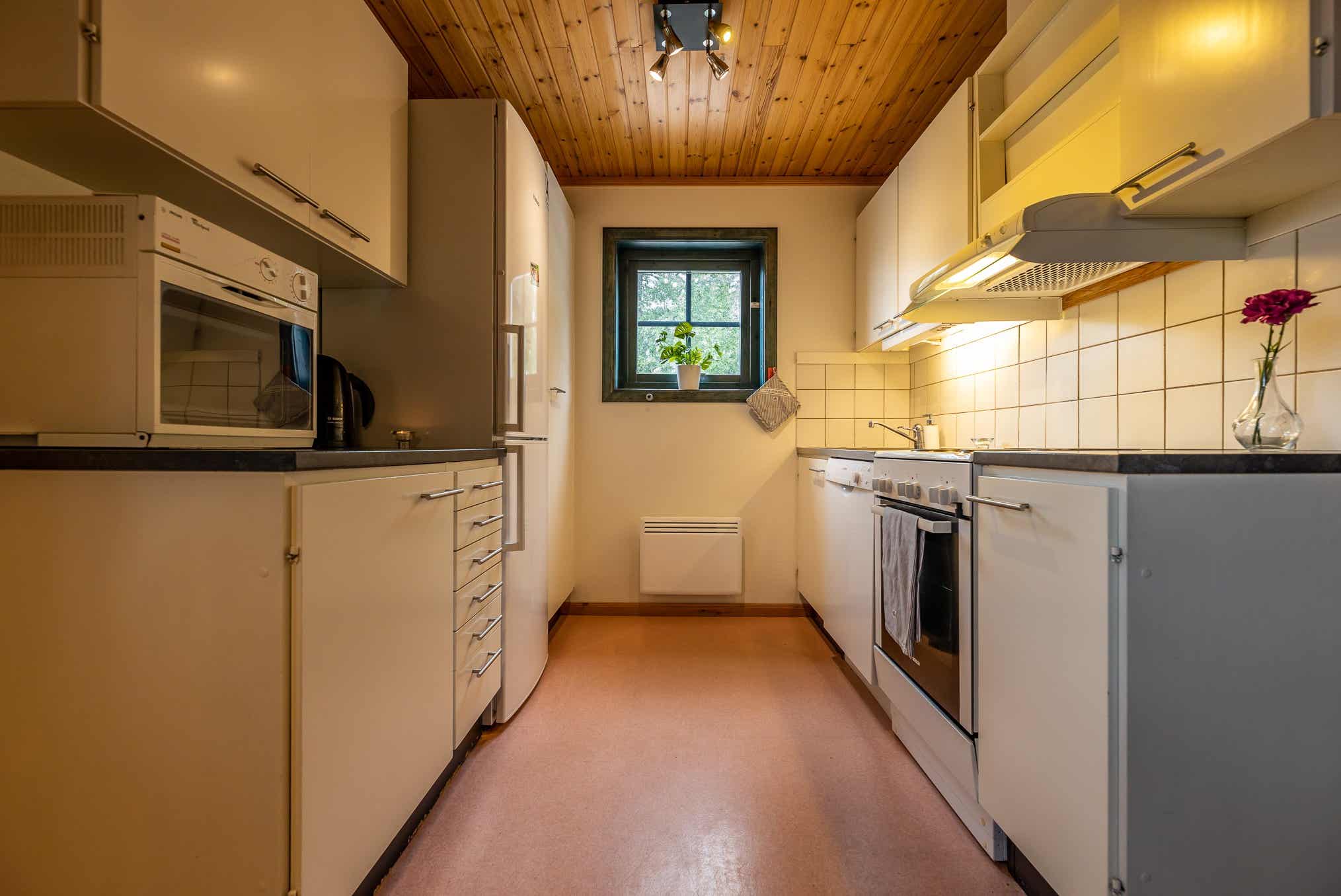 De keuken is voorzien van fornuis met oven, magnetron, vaatwasser, koelkast, vriezer.