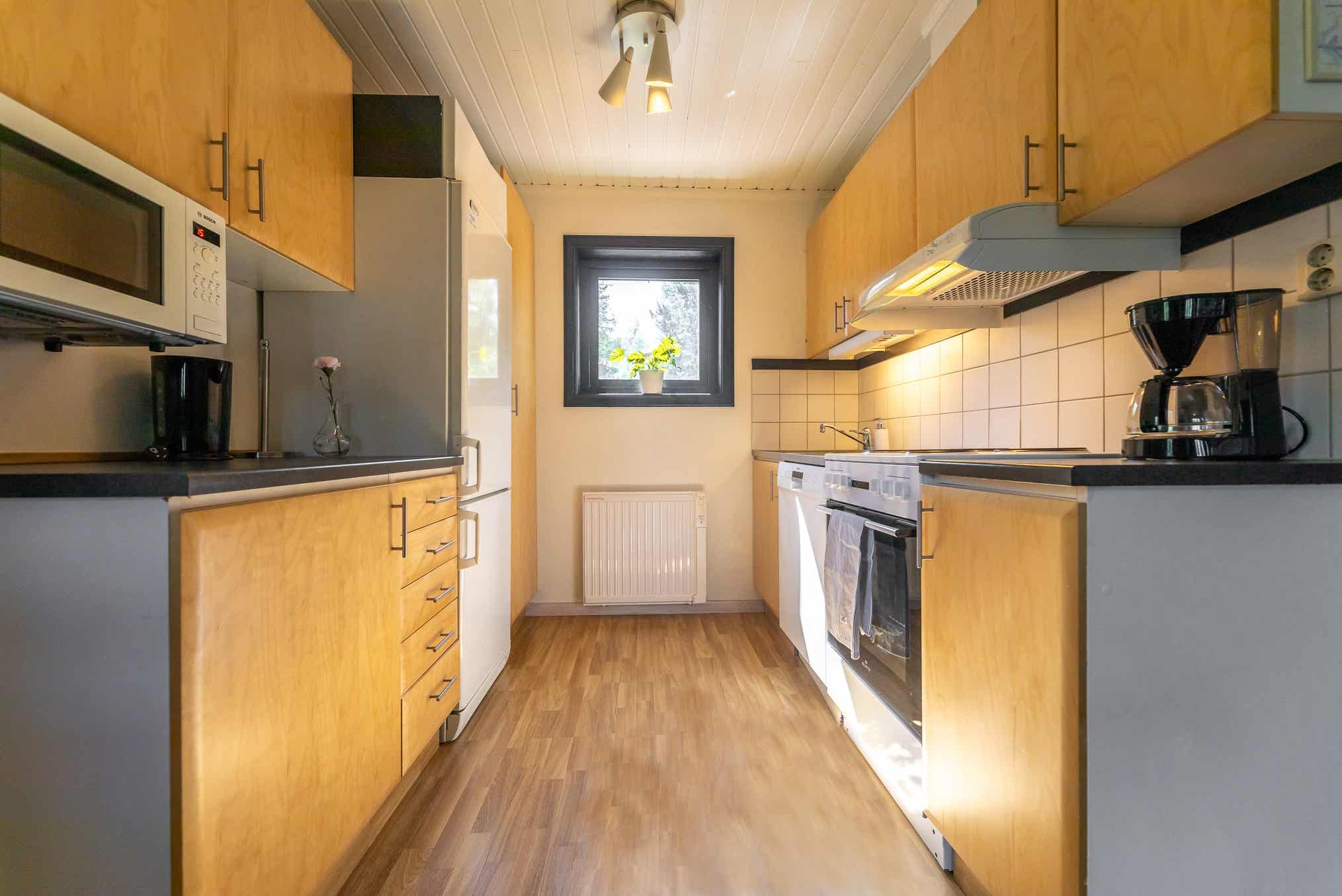 De keuken is voorzien van fornuis met oven, magnetron, vaatwasser, koelkast, vriezer.