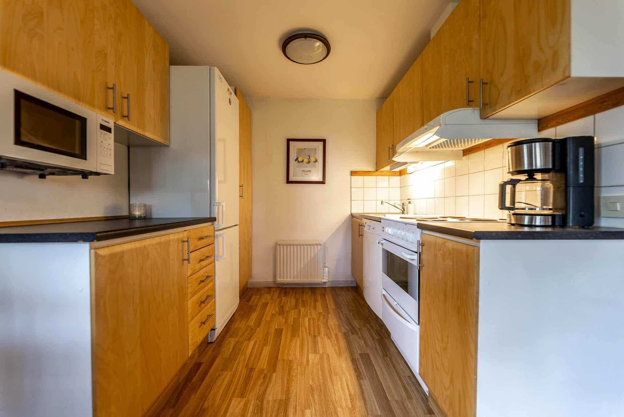De keuken is voorzien van fornuis met oven, magnetron, vaatwasser, koelkast, vriezer.