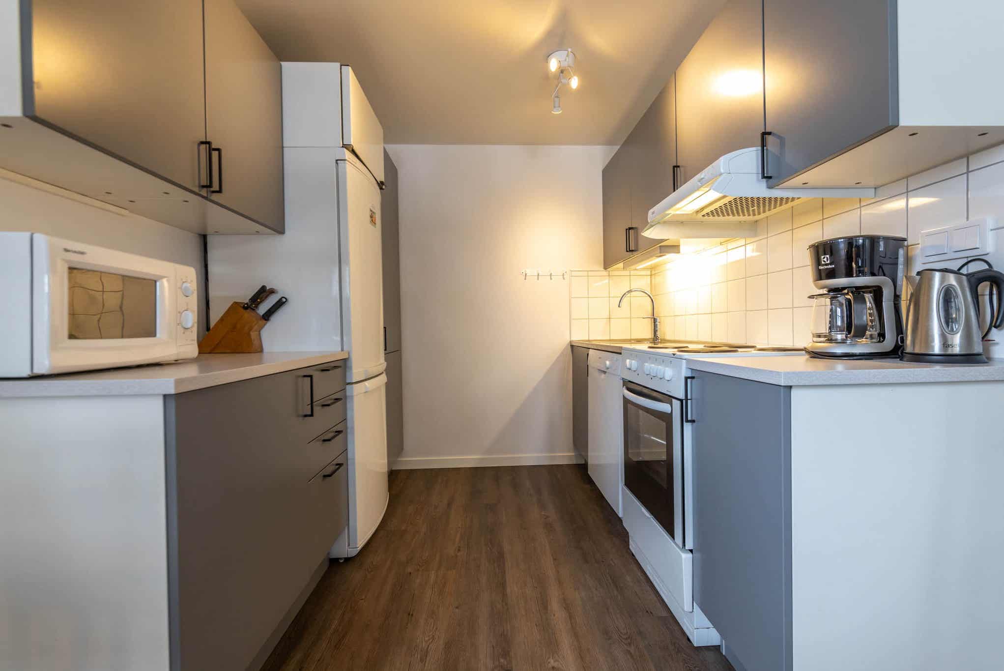 De keuken is voorzien van fornuis met oven, magnetron, vaatwasser, koelkast, vriezer.