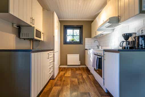 De keuken is voorzien van fornuis met oven, magnetron, vaatwasser, koelkast, vriezer.