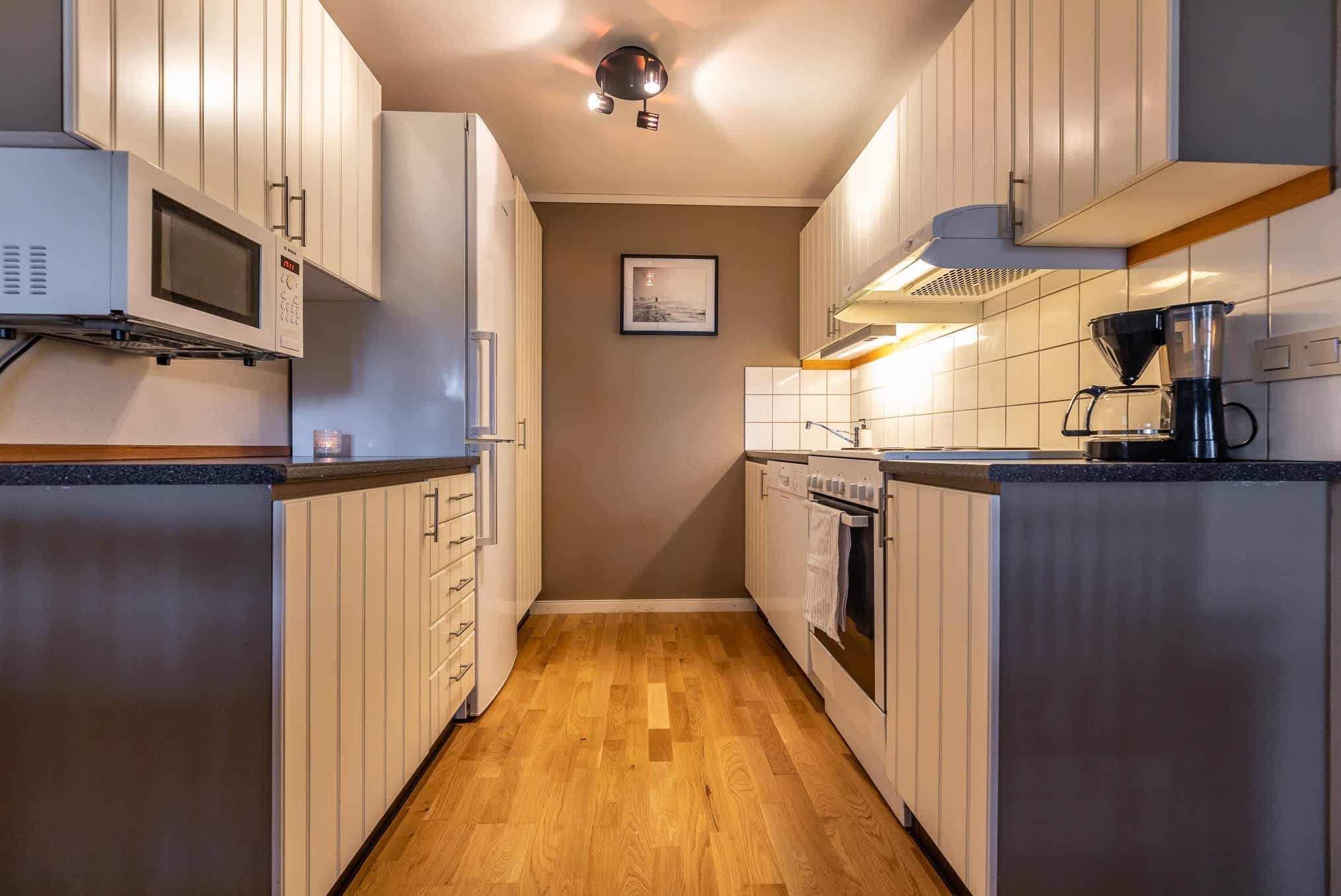 De keuken is voorzien van fornuis met oven, magnetron, vaatwasser, koelkast, vriezer.