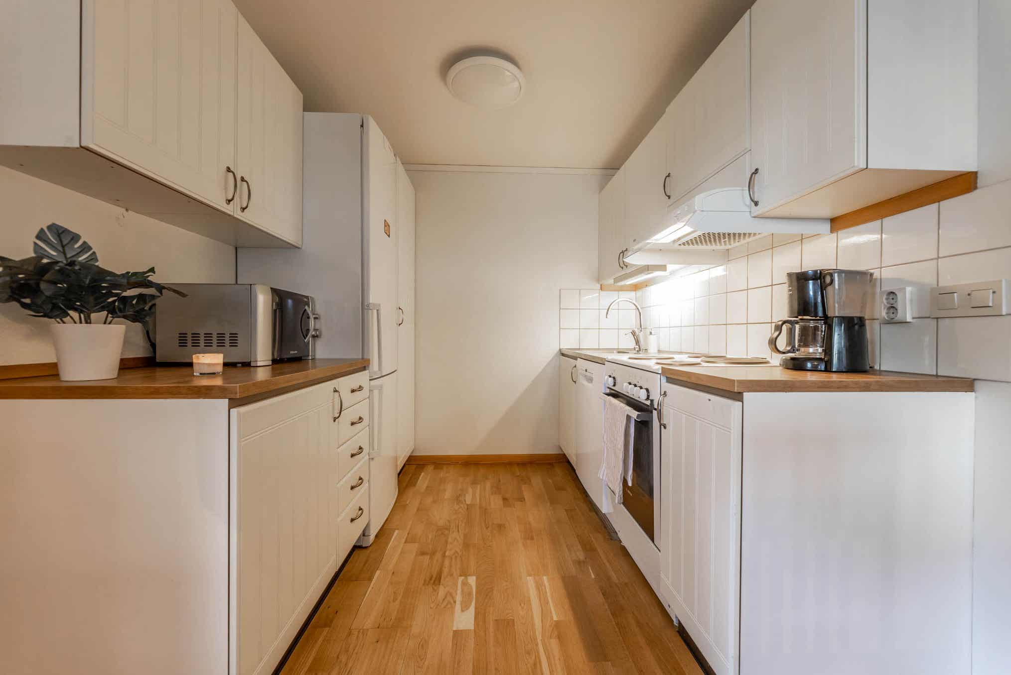De keuken is voorzien van fornuis met oven, magnetron, vaatwasser, koelkast, vriezer.