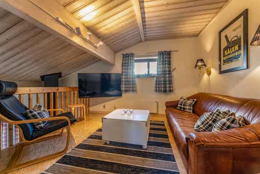 Sälfjällstangen bevindt zich in Högfjället. halfvrijstaand huis met drie verdiepingen, 10+2 bedden, 116 m², woonkamer met gecombineerde keuken, 5 slaapkamers, 2 douches, 2 toiletten, sauna.
