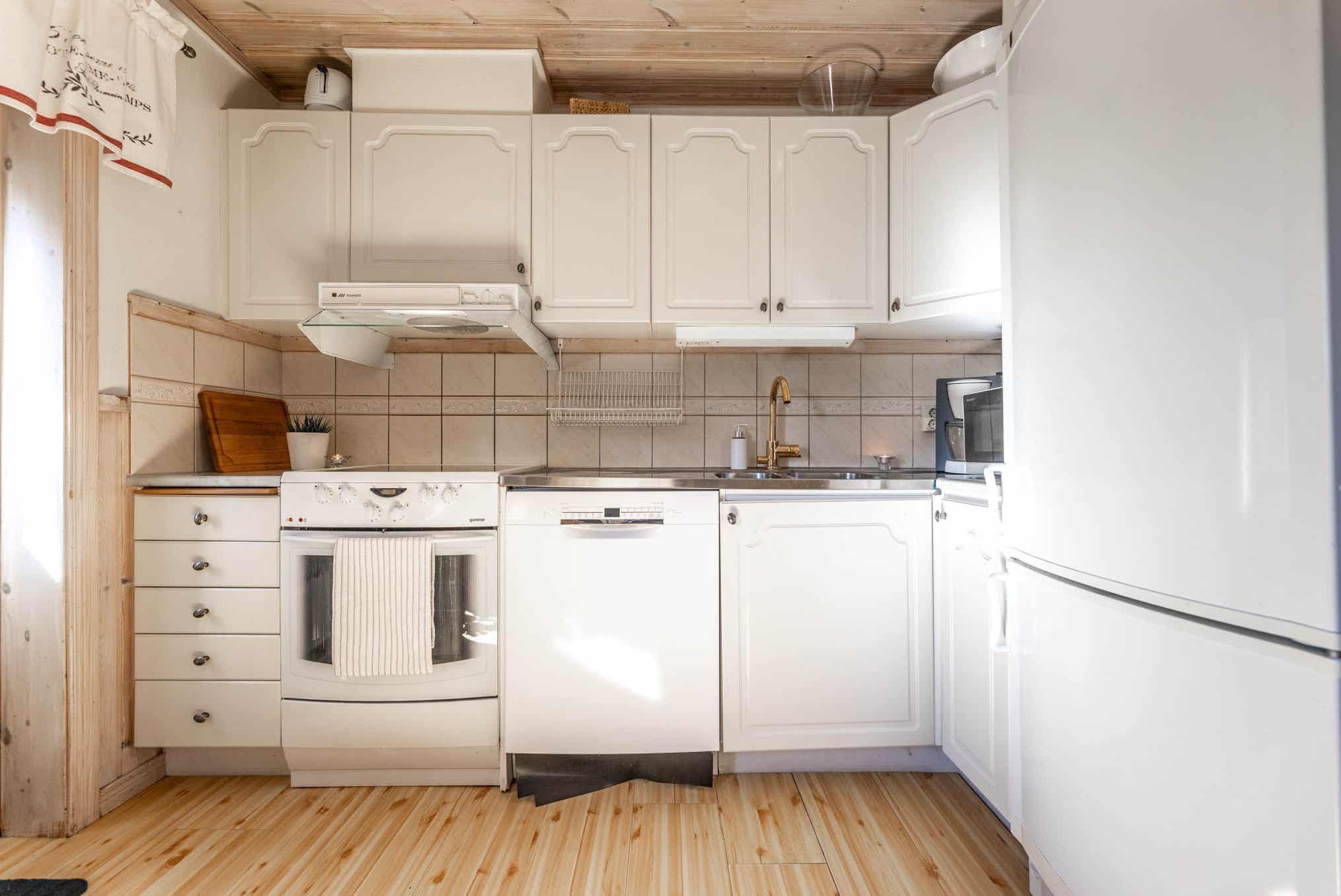 De keuken is voorzien van elektrische kookplaat met oven, koelkast, vriezer, vaatwasser, magnetron.