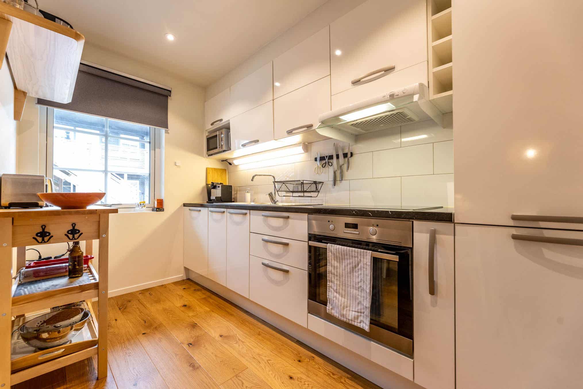 De keuken is voorzien van fornuis met oven, koelkast, vriezer, vaatwasser, magnetron.