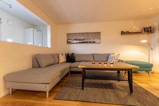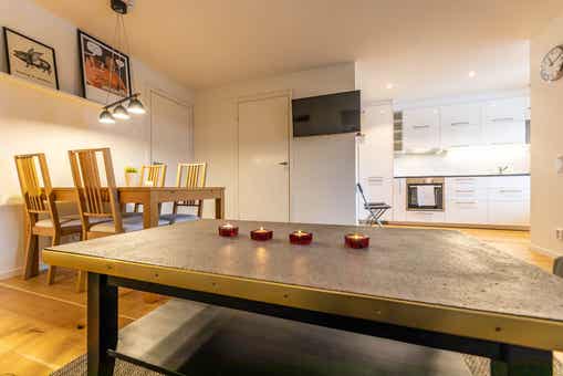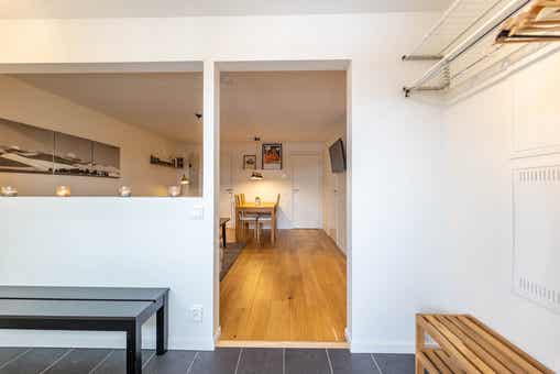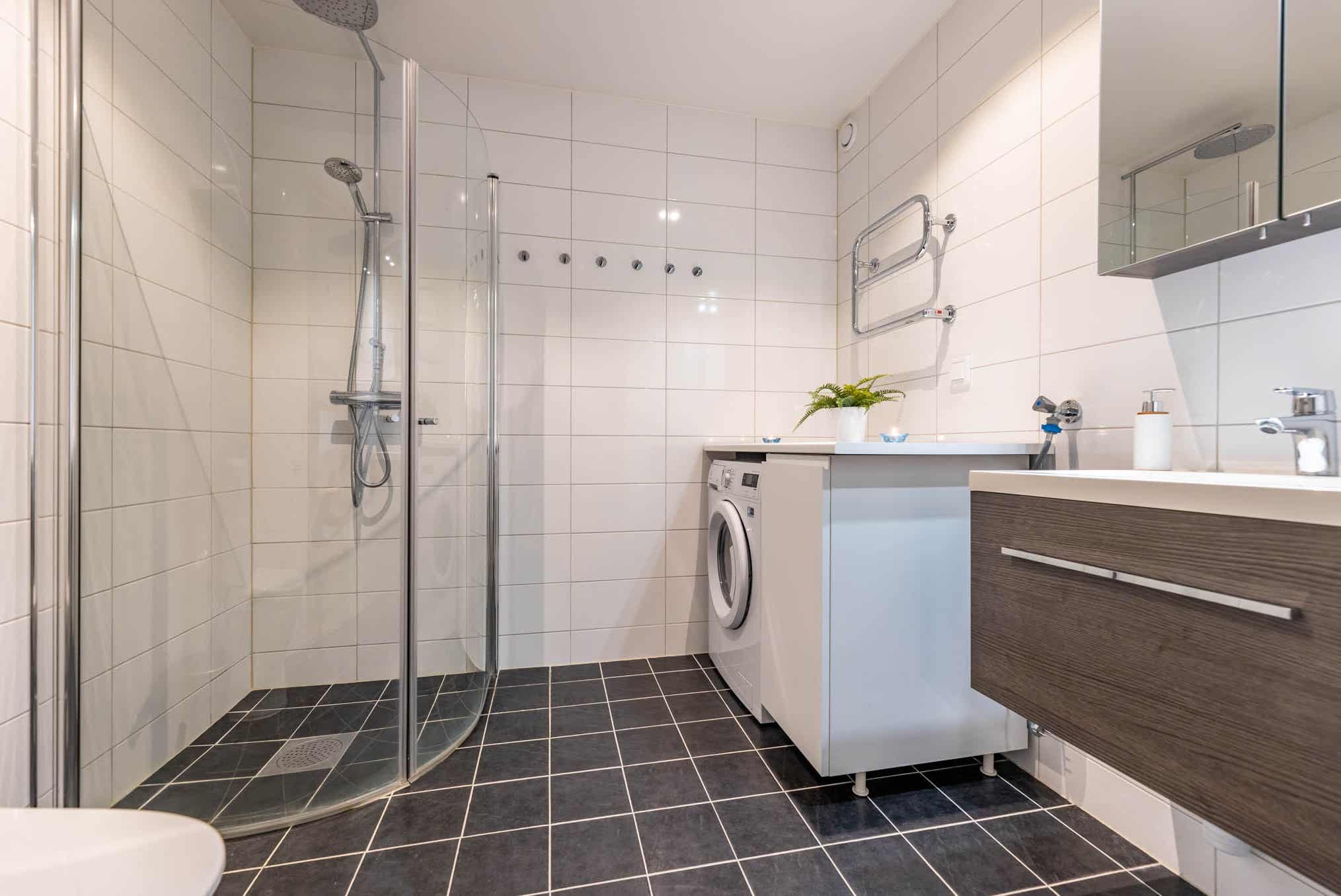 TV, gecombineerde wasmachine en droger, berging voor ski’s.