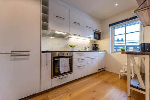 De keuken is voorzien van elektrische kookplaat, inbouwoven, koelkast, vriezer, vaatwasser, magnetron.