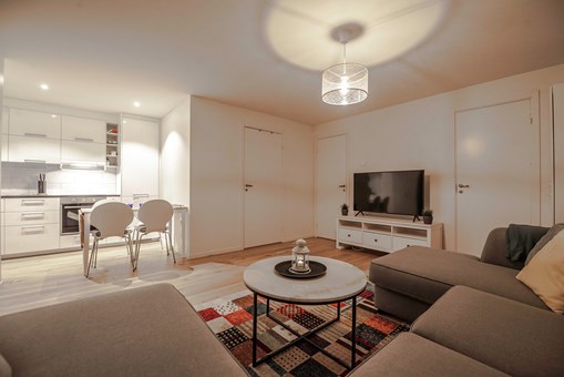 Woonkamer met gecombineerde keuken.