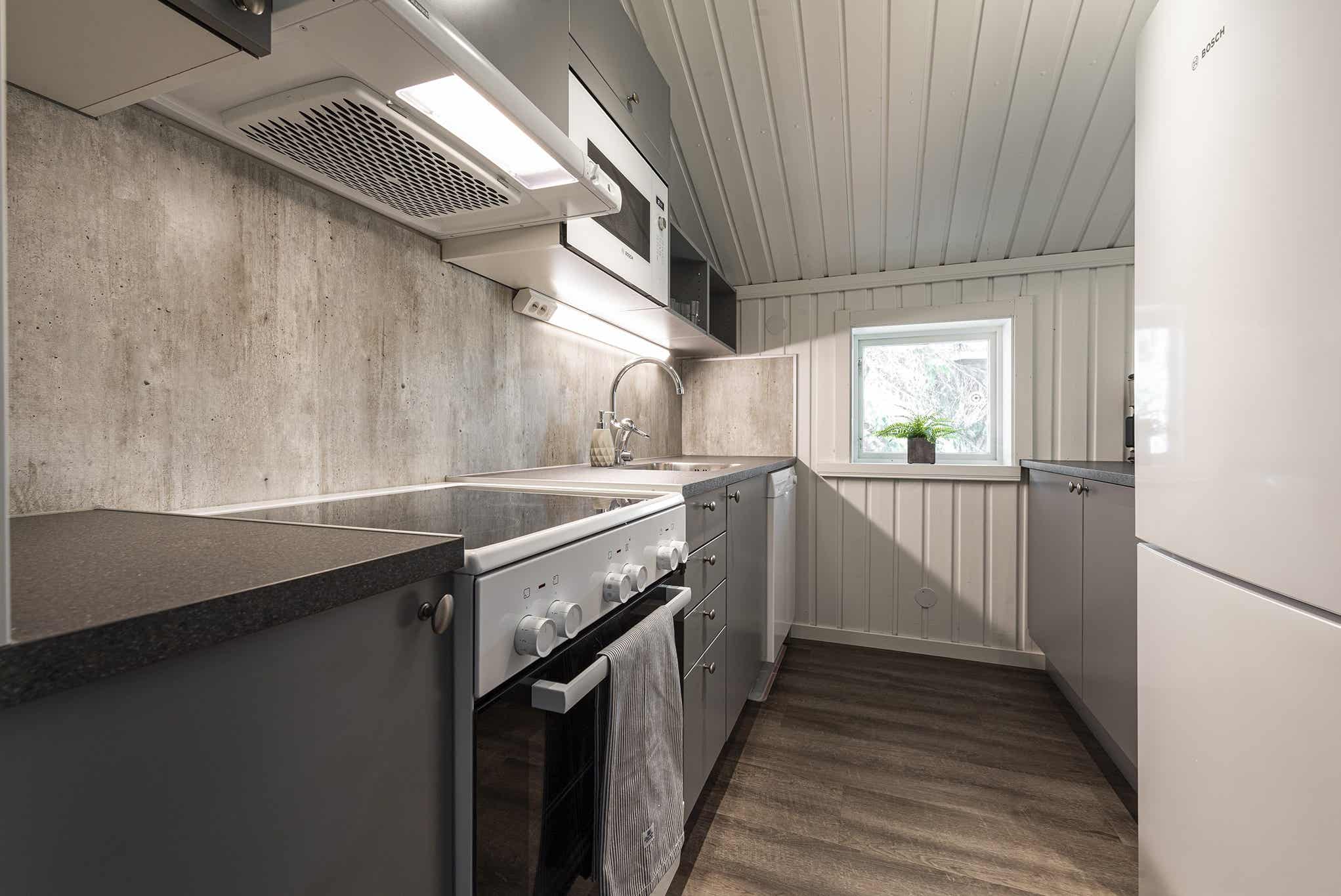 De keuken is voorzien van elektrische kookplaat met oven, koelkast, vriezer, vaatwasser, magnetron.