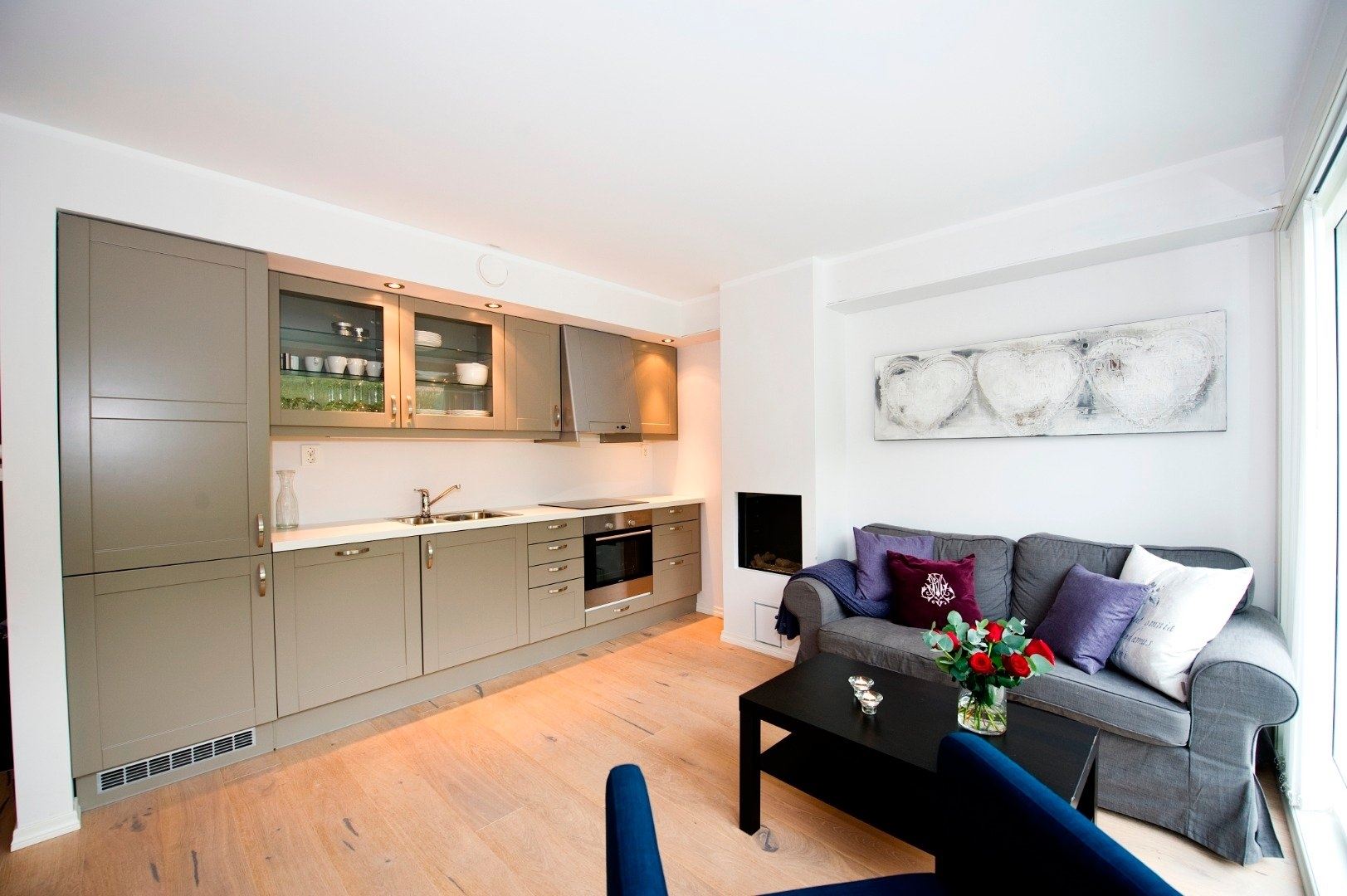 Open woon-/keukengedeelte, badkamer (douche) en 2 slaapkamers