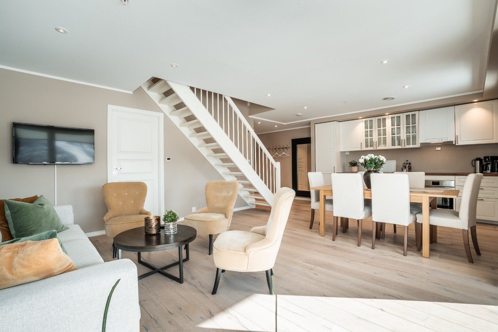 Entree, hal, open woonkamer/keuken, 2 badkamers en 3 slaapkamers (2 verdiepingen)