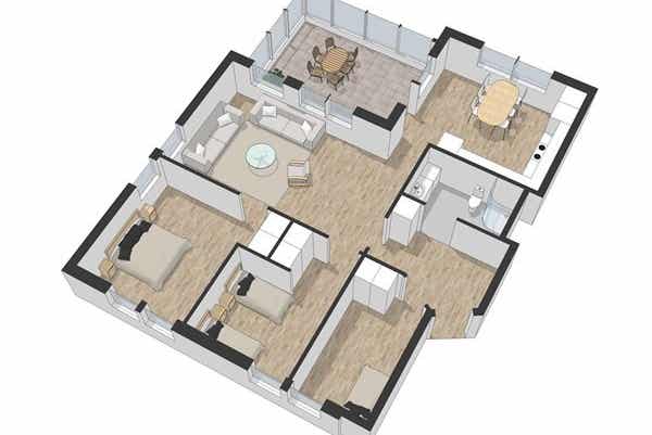 Slaapkamers:Slaapkamer-1 = 1 tweepersoonsbed. Slaapkamer-2 = 2 eenpersoonsbedden. Slaapkamer-3 = 1 stapelbed met breed onderbed.
