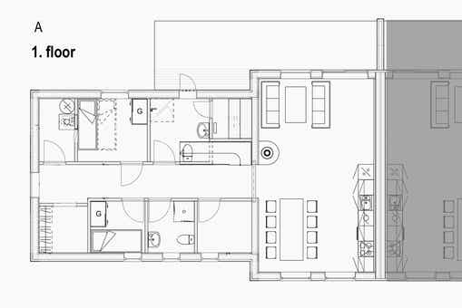 Appartement op de eerste verdieping met vide, 6+4 bedden, 100 m², woonkamer met gecombineerde keuken, 3 slaapkamers, 2 douches, 2 WC, 1 sauna.