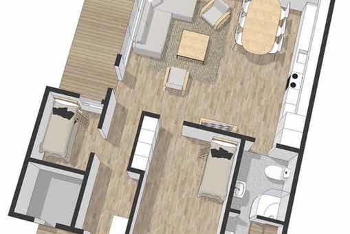 Appartement op de begane grond, 6 bedden, 55 m², woonkamer met gecombineerde keuken, 2 slaapkamers, 1 douche, 1 toilet.