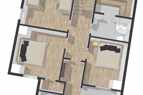 Appartement op de eerste verdieping, 10 bedden, 100 m², woonkamer met gecombineerde keuken, 4 slaapkamers, 1 douche, 2 WC, 1 sauna.
