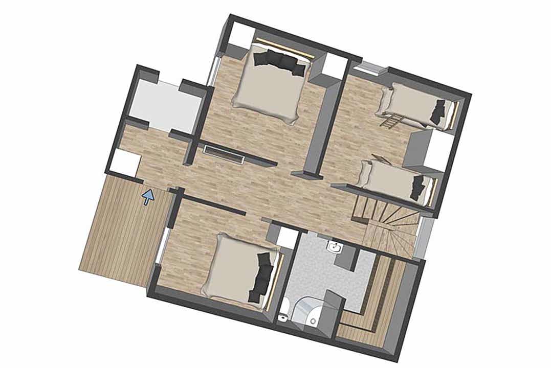 Appartement op de eerste verdieping, 10 bedden, 100 m², woonkamer met gecombineerde keuken, 4 slaapkamers, 1 douche, 1 toilet, 1 sauna.