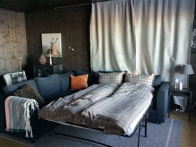 Er is ook een slaapbank voor twee personen in de woonkamer. Vergeet niet om extra beddengoed te bestellen als u van plan bent deze te gebruiken.
