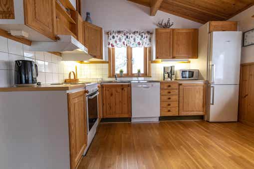 De keuken is voorzien van fornuis met oven, koelkast, vriezer, magnetron, vaatwasser.