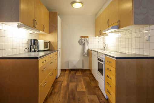 De keuken is voorzien van fornuis met oven, koelkast, vriezer, vaatwasser, magnetron.