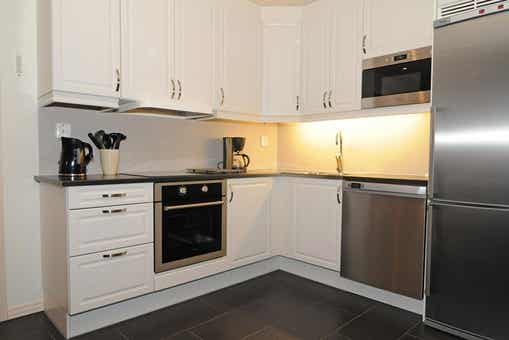 De keuken is voorzien van elektrische kookplaat met oven, koelkast, vriezer, vaatwasser, magnetron.
