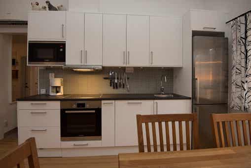 De keuken is voorzien van fornuis met oven, koelkast, vriezer, vaatwasser, magnetron.