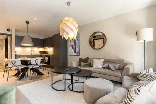 Fjellandsbyen ligt bij Hemsedal Skisenter. Appartement op verdieping 3, 2+3 bedden, 54 m², woonkamer met gecombineerde keuken, 1 slaapkamers, 1 bedstede, 1 douche, 1 toilet, bouwjaar 2024.
