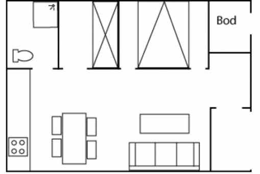 Appartement op de begane grond, 4 bedden, 34 m², woonkamer met gecombineerde keuken, 2 slaapkamers, 1 douche, 1 toilet.