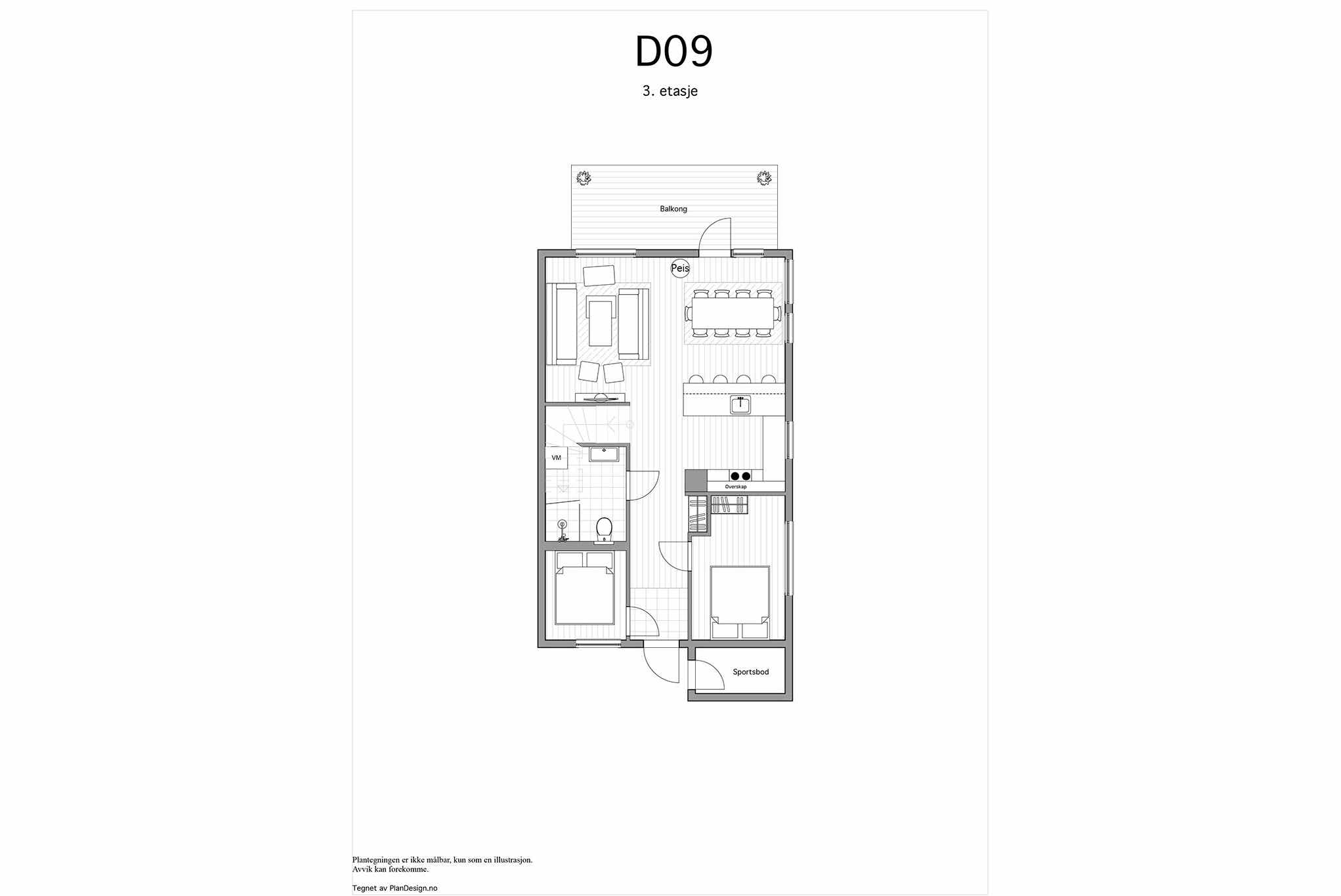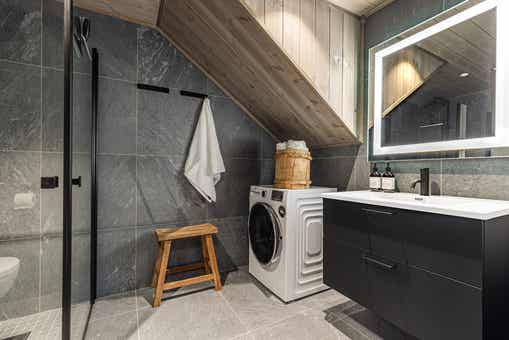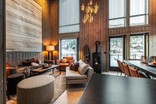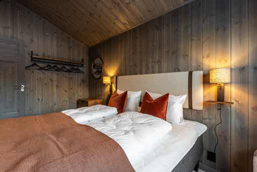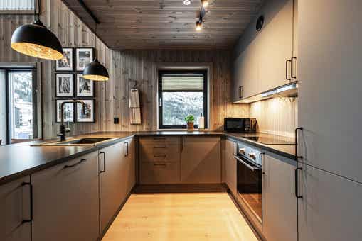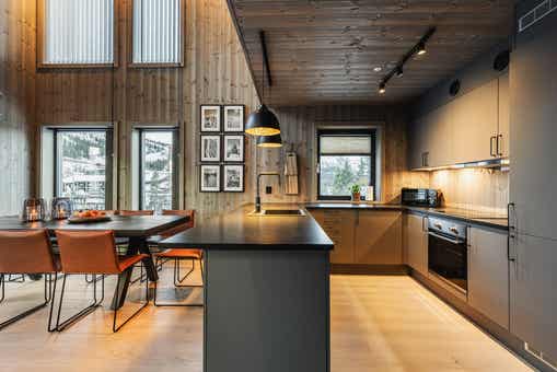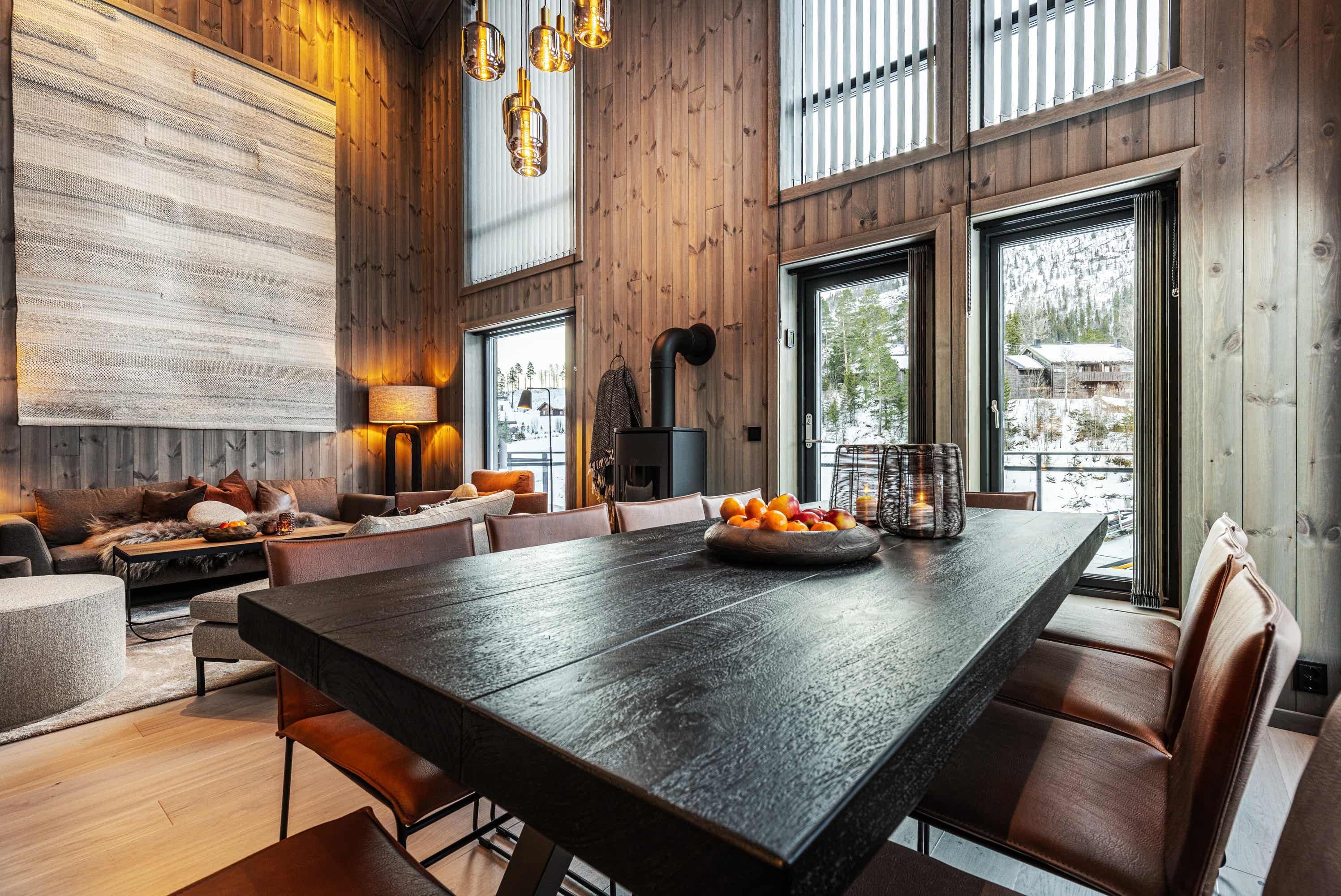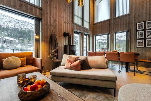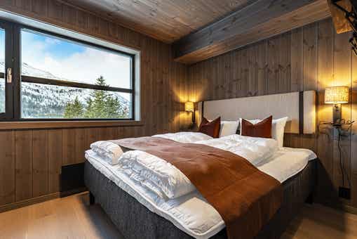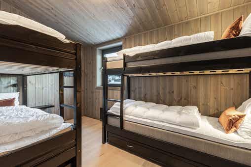 Fjellnest bevindt zich in Hemsedal Skisenter. Appartement van twee verdiepingen op de 3e verdieping met extra woonkamer op de 2e verdieping, 10 bedden, 116 m², woonkamer met gecombineerde keuken, 4 slaapkamers, 2 douches, 2 toiletten, bouwjaar 2023.