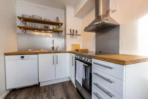 De keuken is voorzien van elektrische kookplaat met oven, koelkast, vriezer, vaatwasser, magnetron.