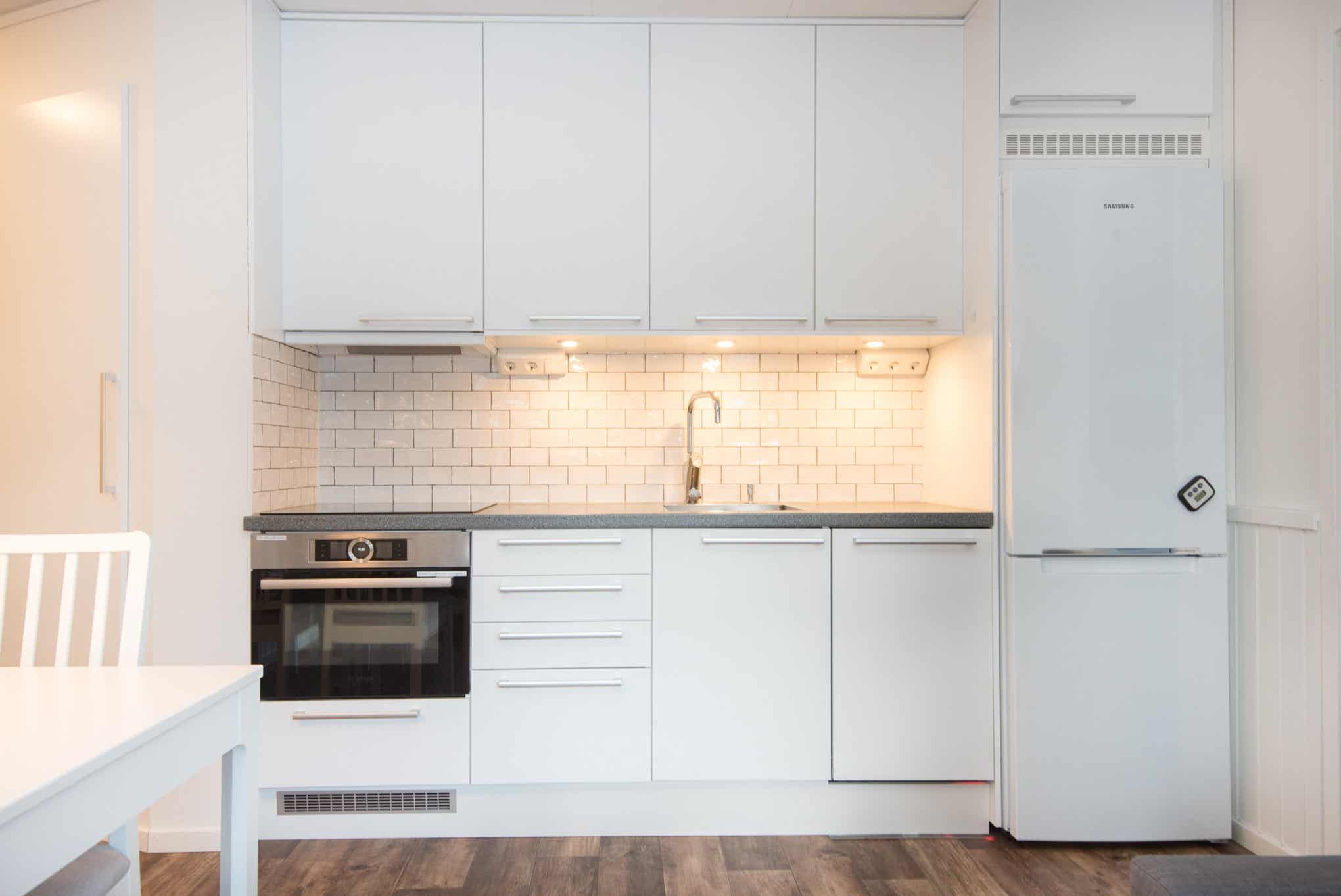 De keuken is voorzien van kookplaat, inbouwoven, koelkast, vriezer, vaatwasser, magnetron.
