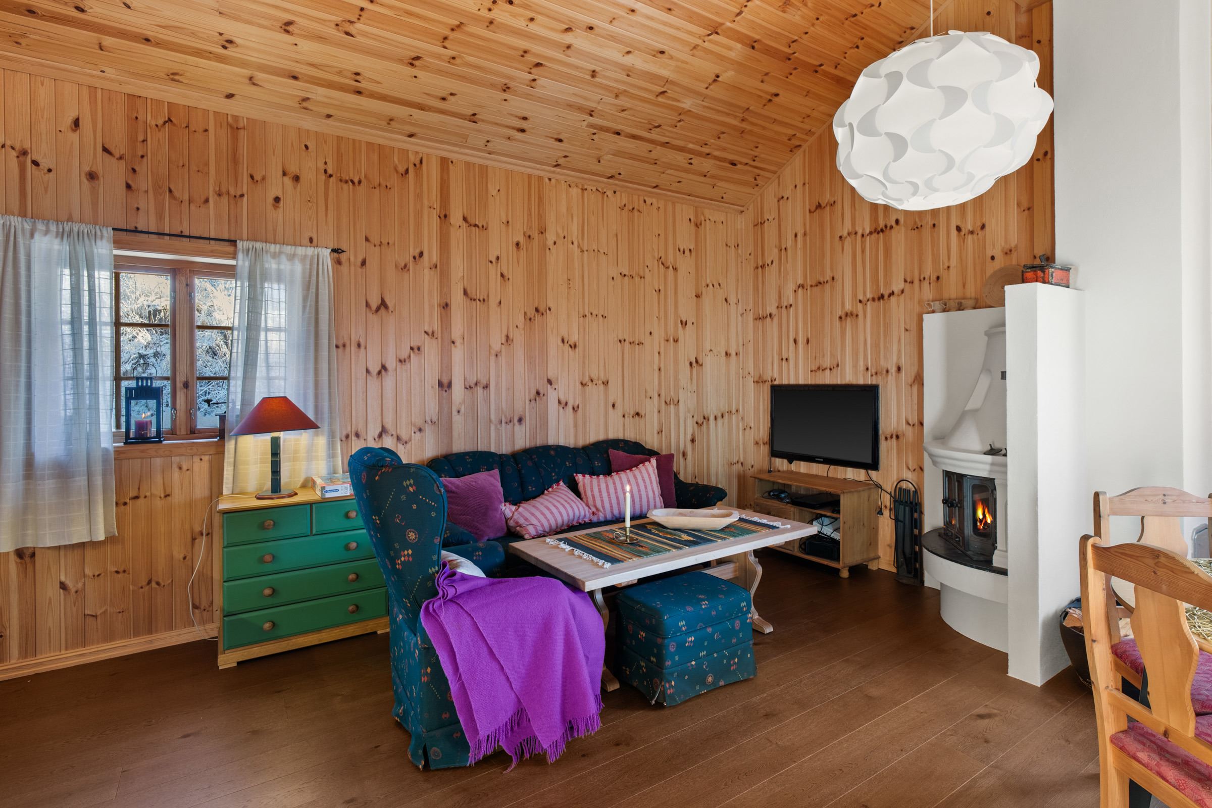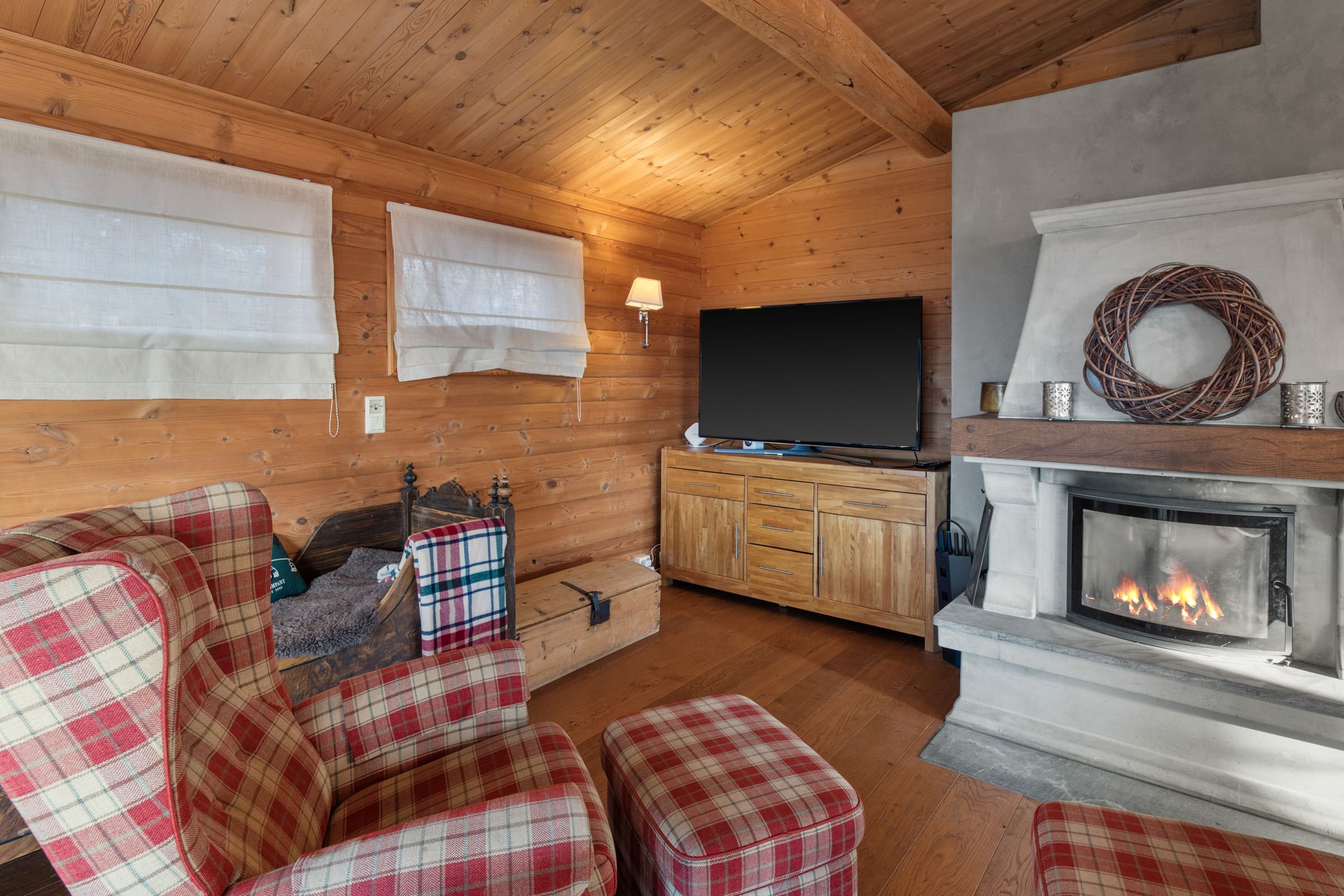 Na een dag vol activiteiten, kunt u ontspannen in de woonkamer, ingericht met een bank, tv en een warme open haard-ideaal voor ontspannen avonden bij het vuur.