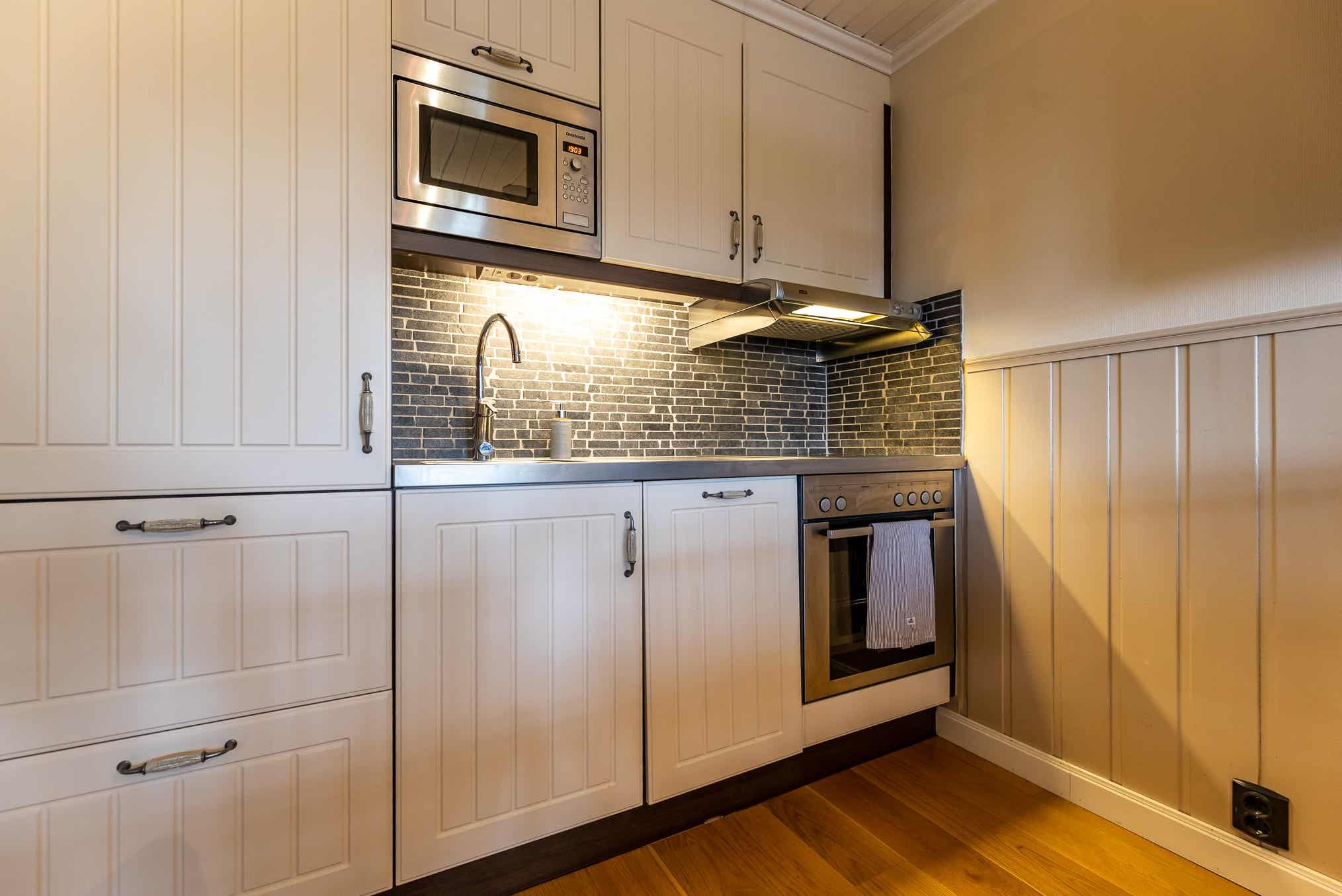 De keuken is voorzien van fornuis met oven, koelkast, vriezer, vaatwasser, magnetron.