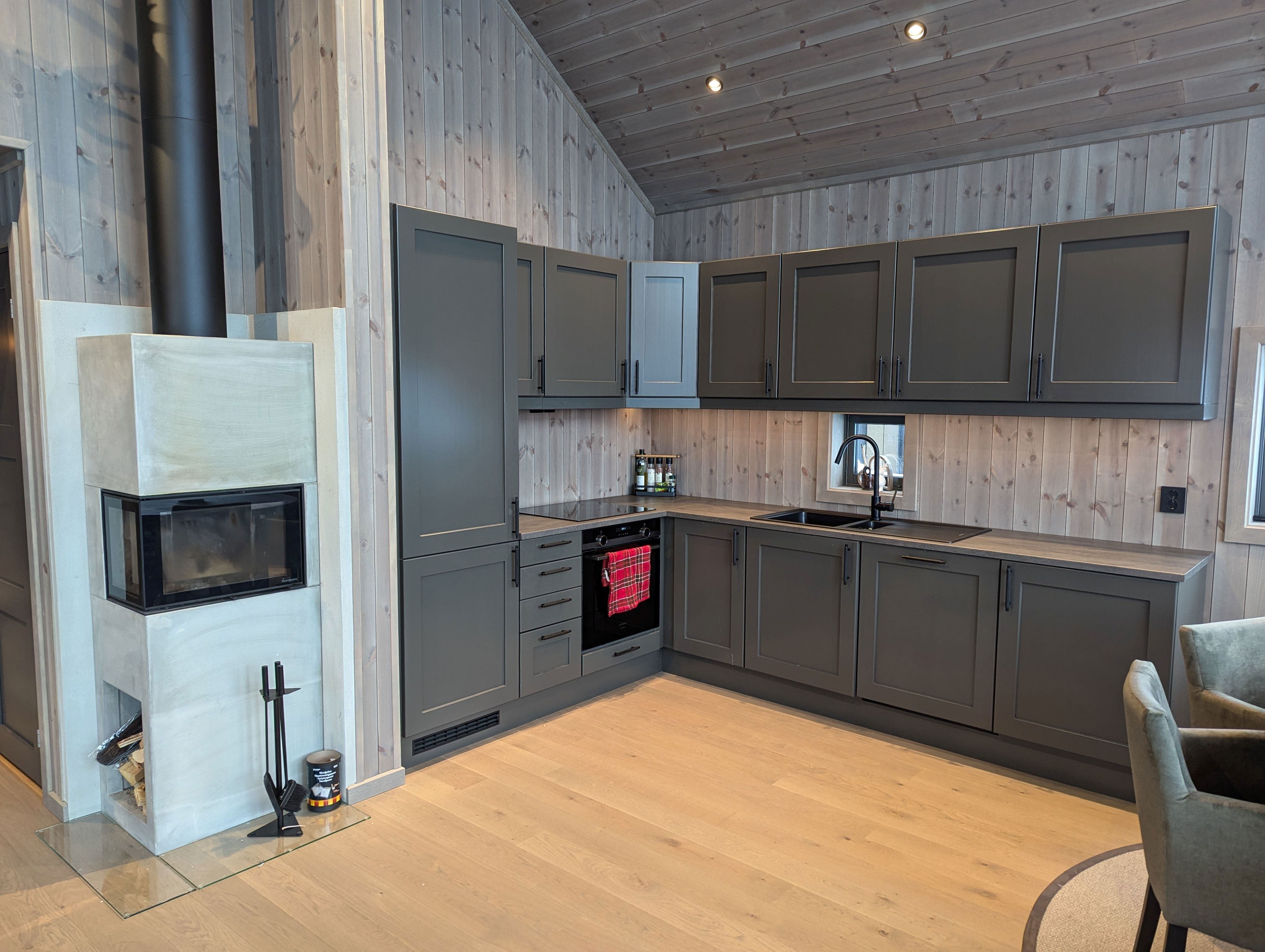 Haugaskogen 77 biedt alles wat u nodig heeft voor een ontspannen verblijf. De keuken is uitgerust met een oven, koelkast, vriezer, vaatwasser en koffiezetapparaat.