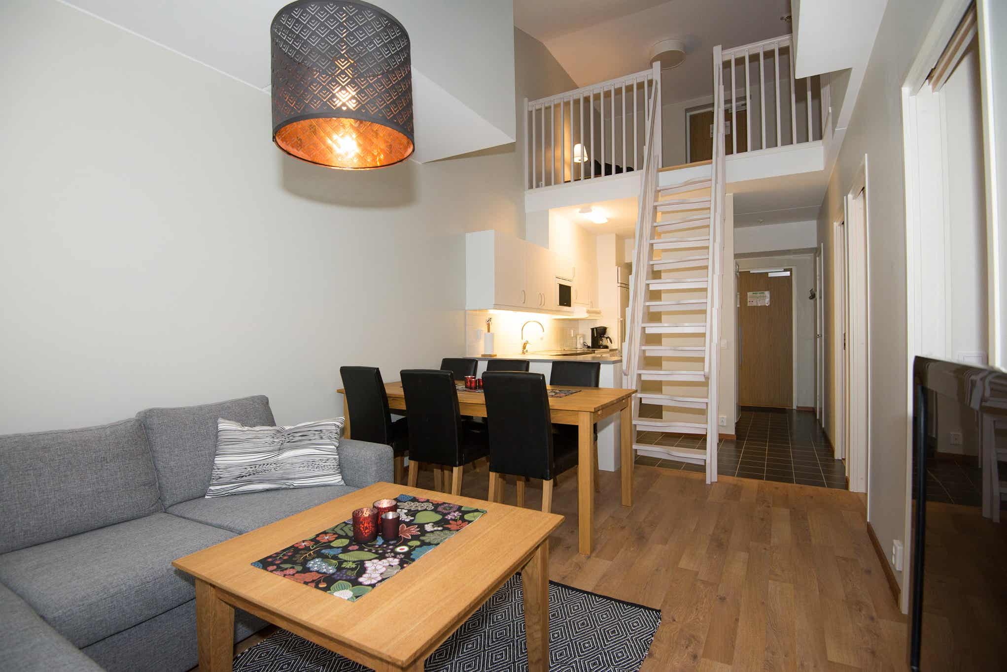 HC Ski Lodge bevindt zich in Högfjället. appartement op de begane grond met vide, 6+0 bedden, 70 m², woonkamer met gecombineerde keuken, 3 slaapkamers, 1 douche, 1 toilet, sauna.