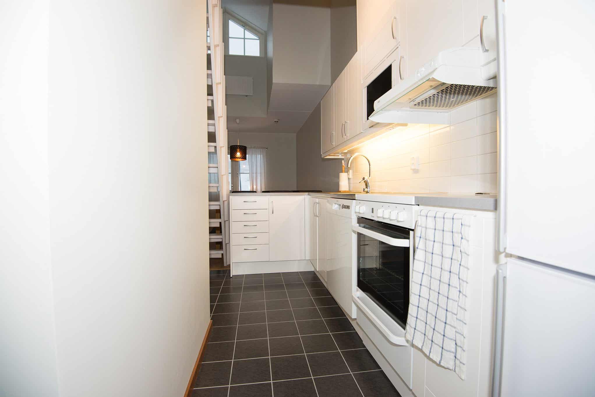 De keuken is voorzien van een elektrische kookplaat met oven, koelkast, vriezer, vaatwasser, magnetron.